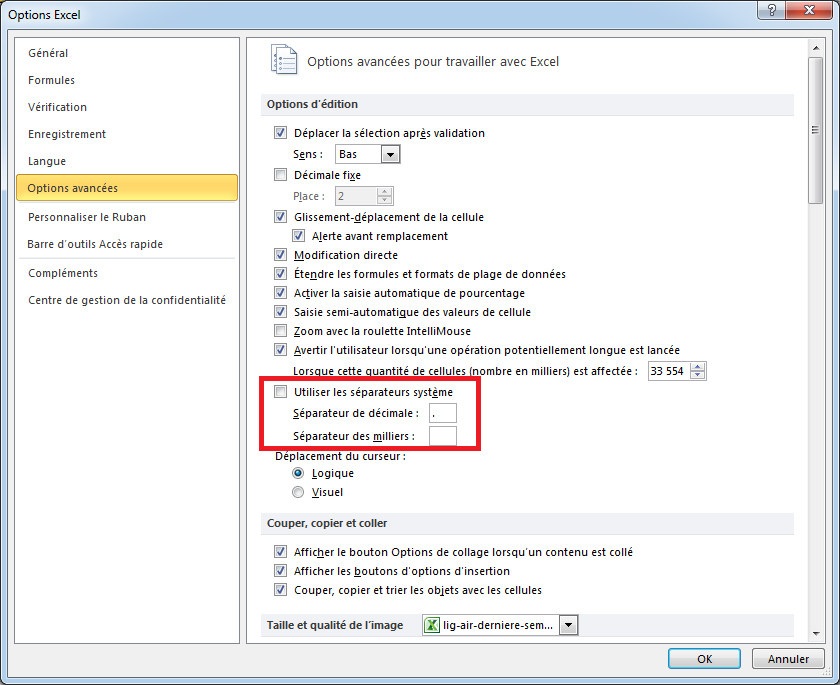 Après de nombreux bidouillages plus ou moins efficaces, je me suis rendu compte que l’opération était finalement très simple à réaliser: il suffit de préciser dans les options d’Excel que l’on ne souhaite pas utiliser les paramètres du système. On peut alors spécifier explicitement les caractères de séparation à utiliser: