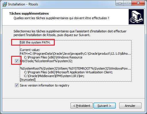 D’autre part, j’autorise l’installeur à modifier le PATH du système pour y inclure le chemin des binaires de Rtools :