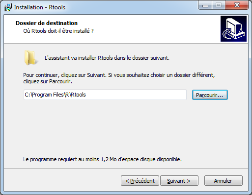 L’installation ne présente aucune difficulté et la plupart des choix par défaut conviennent. Par préférence personnelle, je modifie néanmoins la destination d’installation pour C:\Program Files\R\Rtools :