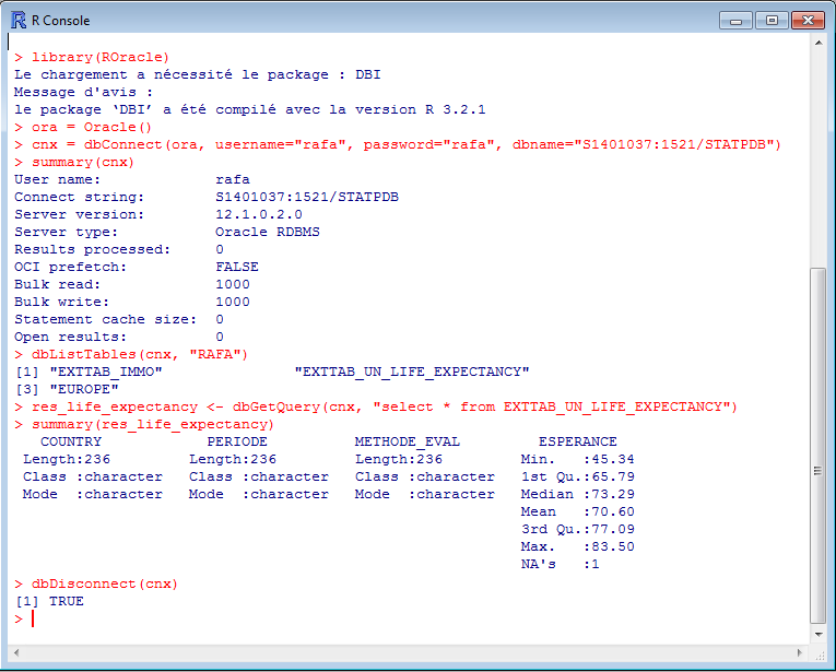 On peut donc directement accéder les données d’un SGBD Oracle à partir de R. En revanche, il faut bien garder à l’esprit que les données sont ingérées (via un fetch) par R. Elles montent donc en mémoire sur le poste client et cela peut poser des problèmes pour les datasets très volumineux.