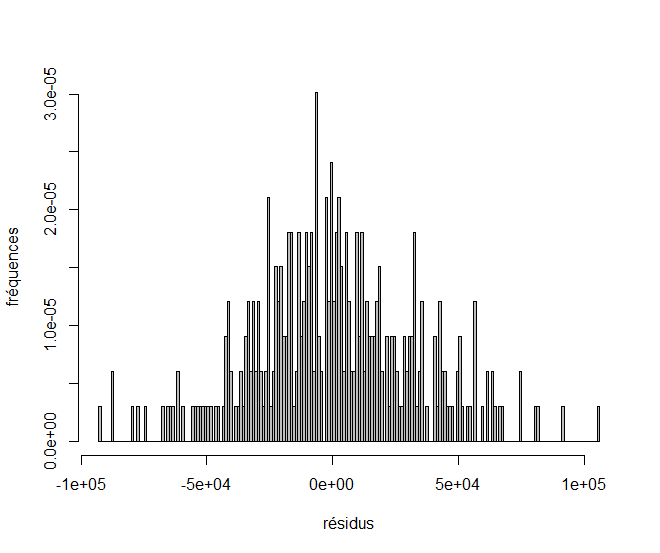 > hist(resid(res), freq = F, col ="grey", main="", xlab="résidus", ylab="fréquences", nclass=200)