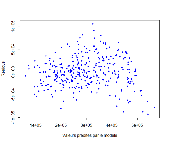 > plot(res$fitted.values, res$residuals, + xlab="Valeurs prédites par le modèle", + ylab="Résidus", pch=16, cex=0.75, col="blue") >