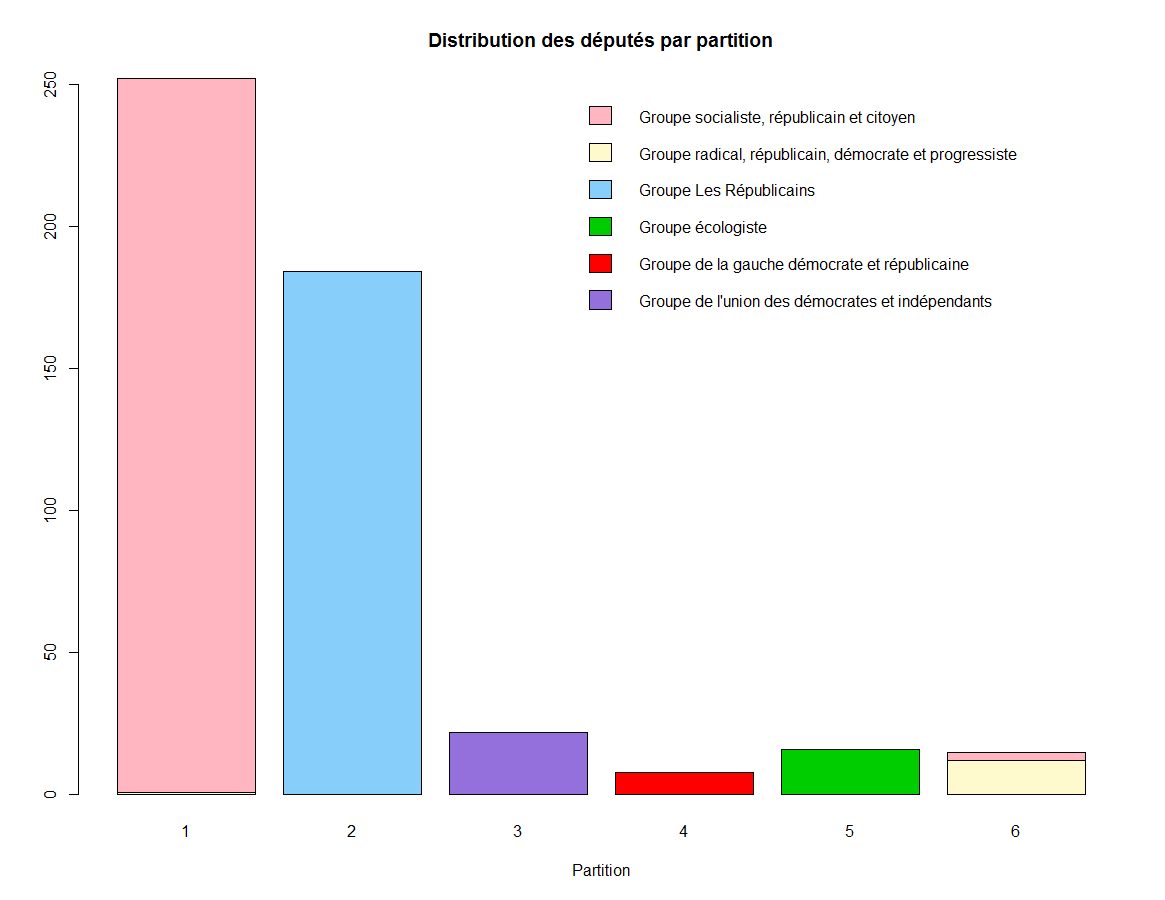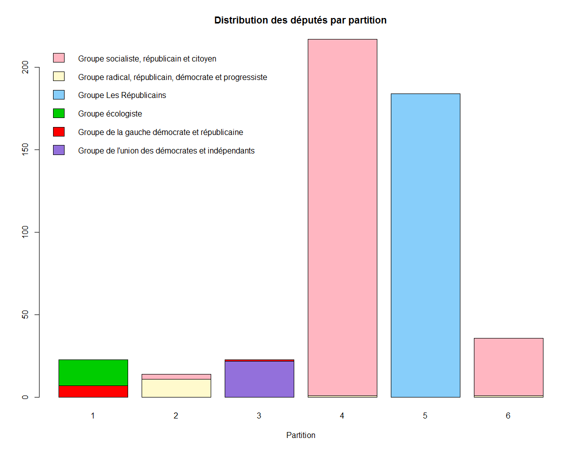 Le partitionnement est effectué à l’aide de la commande kmeans à laquelle on passe le dataframe votes2part à l’exception des champs DEPUTE et PARTI (colonnes 1 et 2) ainsi que le nombre de partitions souhaitées: 6.