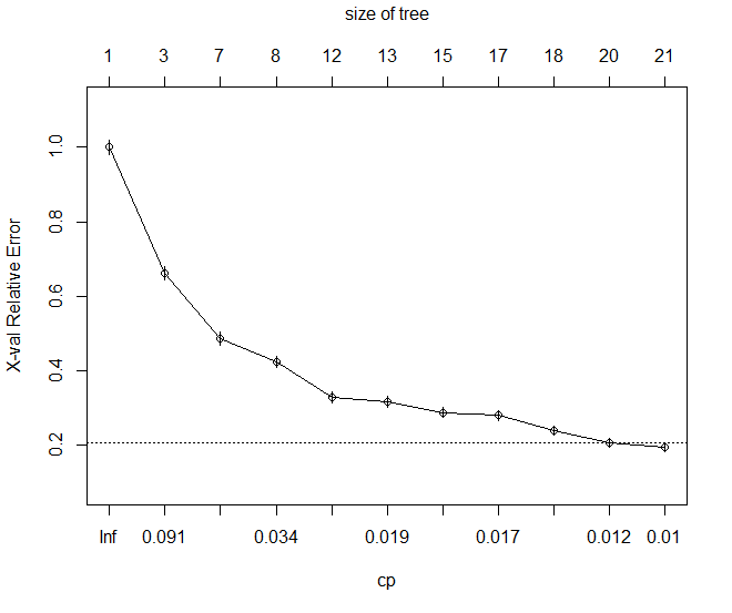 > optimcp <- autos_dt$cptable[which.min(autos_dt$cptable[,"xerror"]),"CP"] > autos_dt.pruned <- prune(autos_dt, cp = optimcp)