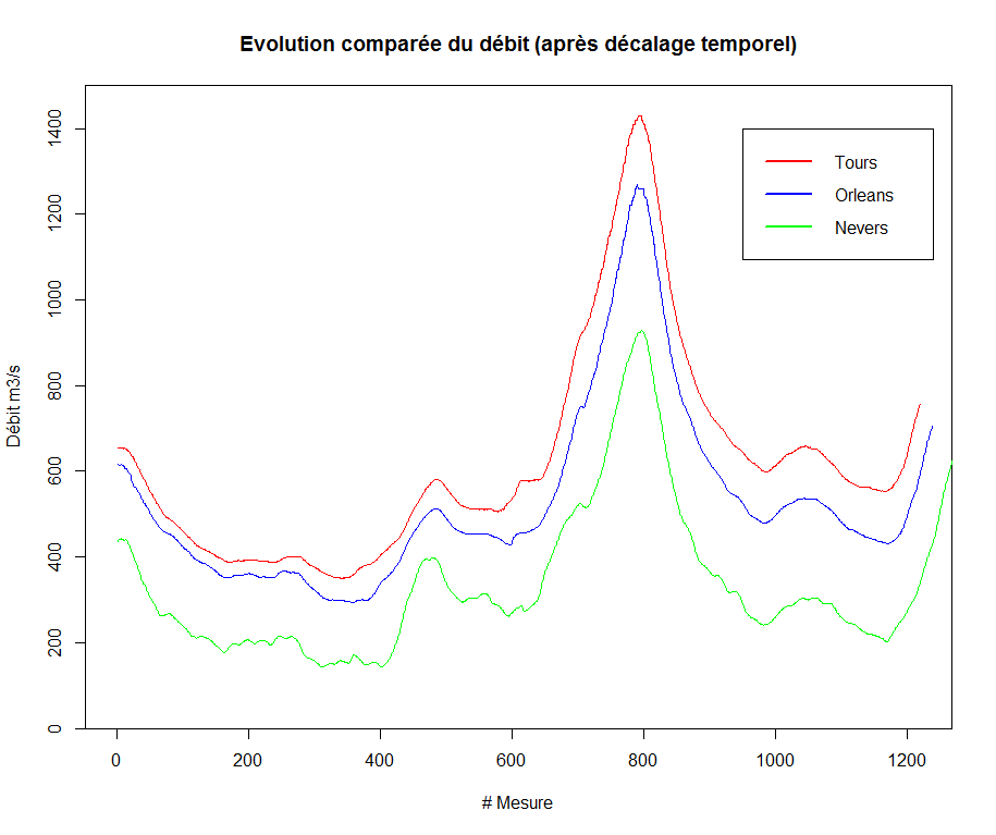 > title("Evolution comparée du débit (après décalage temporel)")