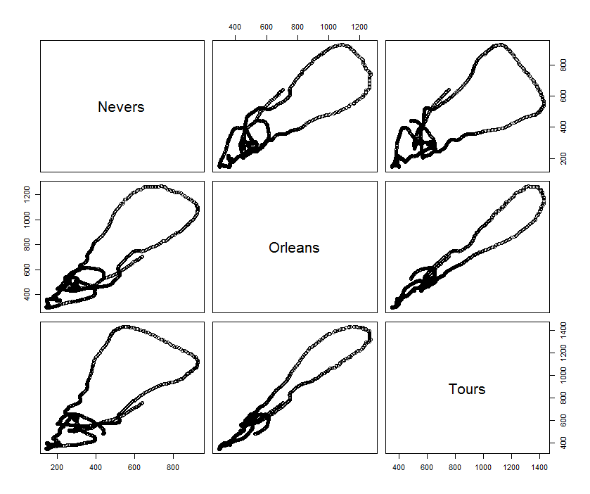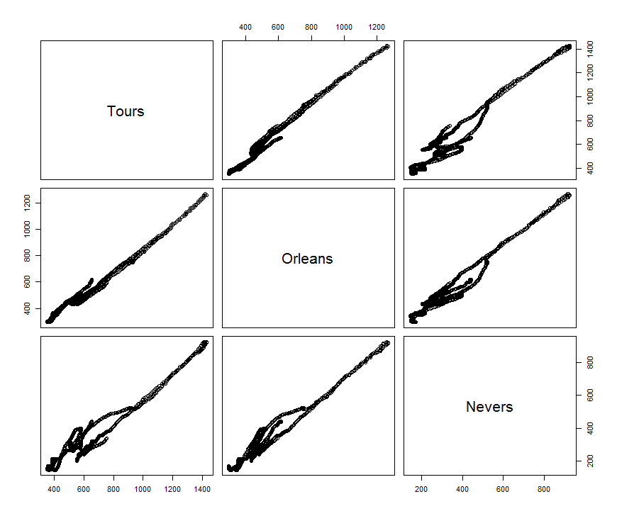 > débits_décalés <- data.frame(debits_loire$Tours[seq(54,length(debits_loire$Tours))]) > names(débits_décalés) <- "Tours" > débits_décalés$Orleans <- debits_loire$Orleans[seq(35,length(debits_loire$Orleans)-(54-35))] > débits_décalés$Nevers <- debits_loire$Nevers[seq(1,length(debits_loire$Nevers)-53)] > pairs(débits_décalés) >