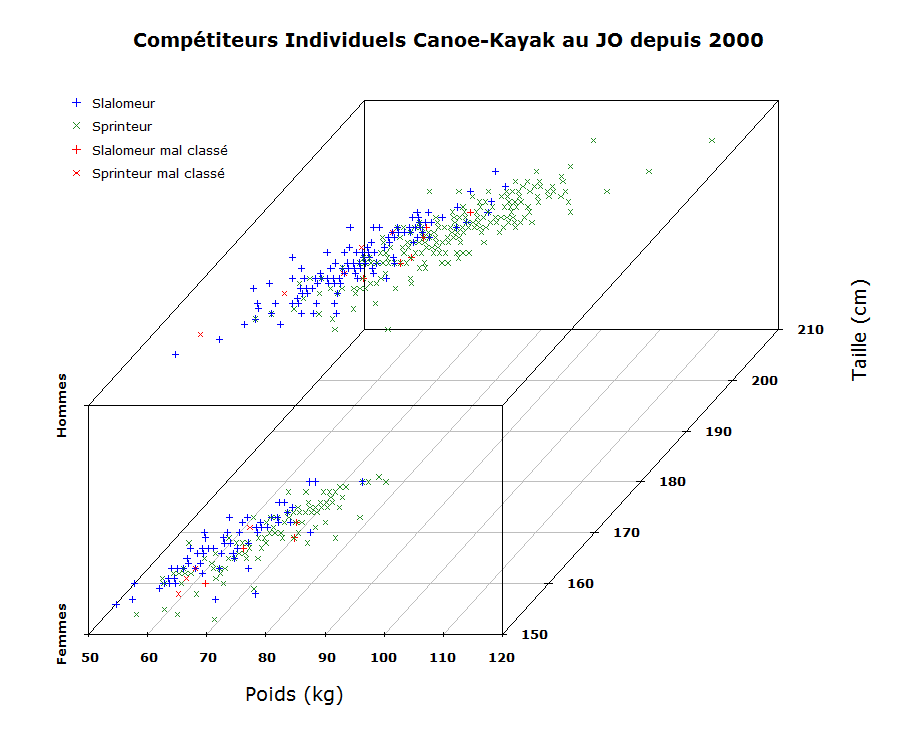 La représentation graphique des données permet de mieux appréhender l’origine des défauts de classification. On remarque bien au passage que les compétiteurs des deux disciplines ont globalement des corpulences différentes: