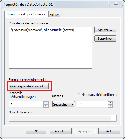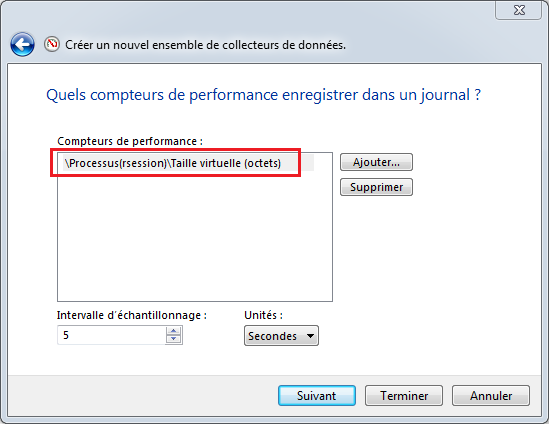 Par curiosité, j’ai taché de suivre sur ma machine l’allocation de la mémoire virtuelle du processus rsession au fur et à mesure du chargement de la table. Pour cela, j’ai utilisé une collecte perfmon dont le paramétrage apparaît dans les deux copies d’écran ci-dessous: