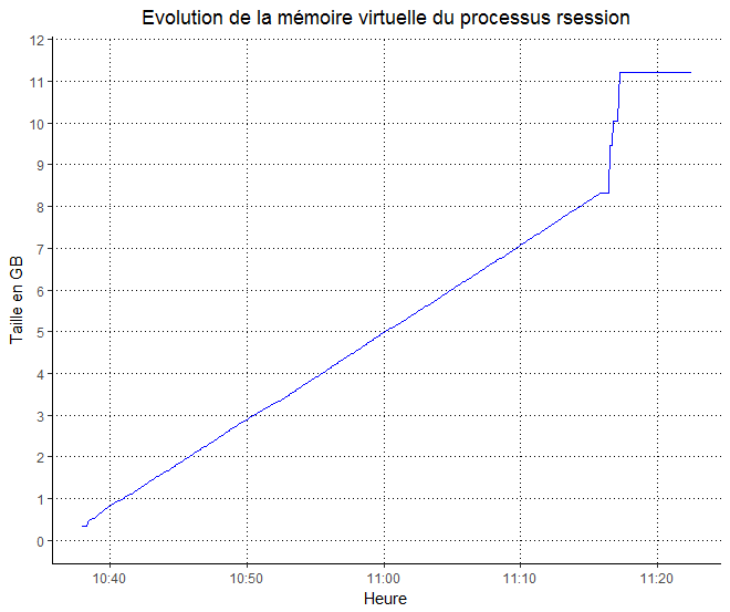 + ggtitle("Evolution de la mémoire virtuelle du processus rsession") +